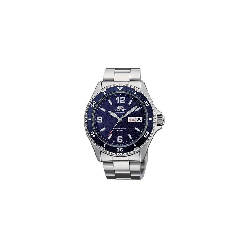 Montre ORIENT, Mouvement automatique + dateur, boitier acier (diam. 42mm), fond bleu, bracelet acier.