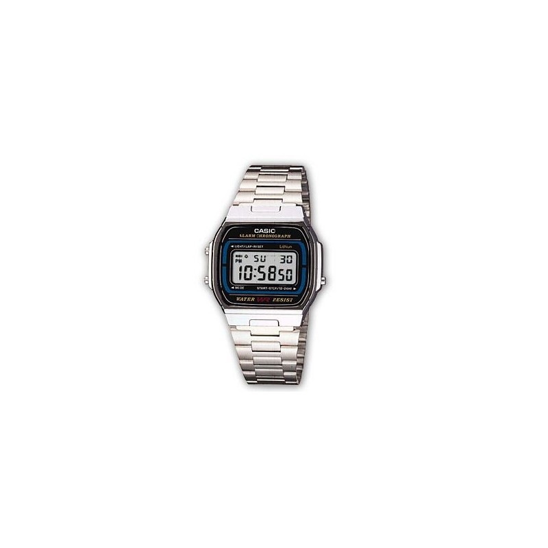 Montre CASIO, Mouvement quartz + dateur, boitier résine (diam. 35mm) fond affichage, bracelet acier. Fonction: Chronomètre, alarme.