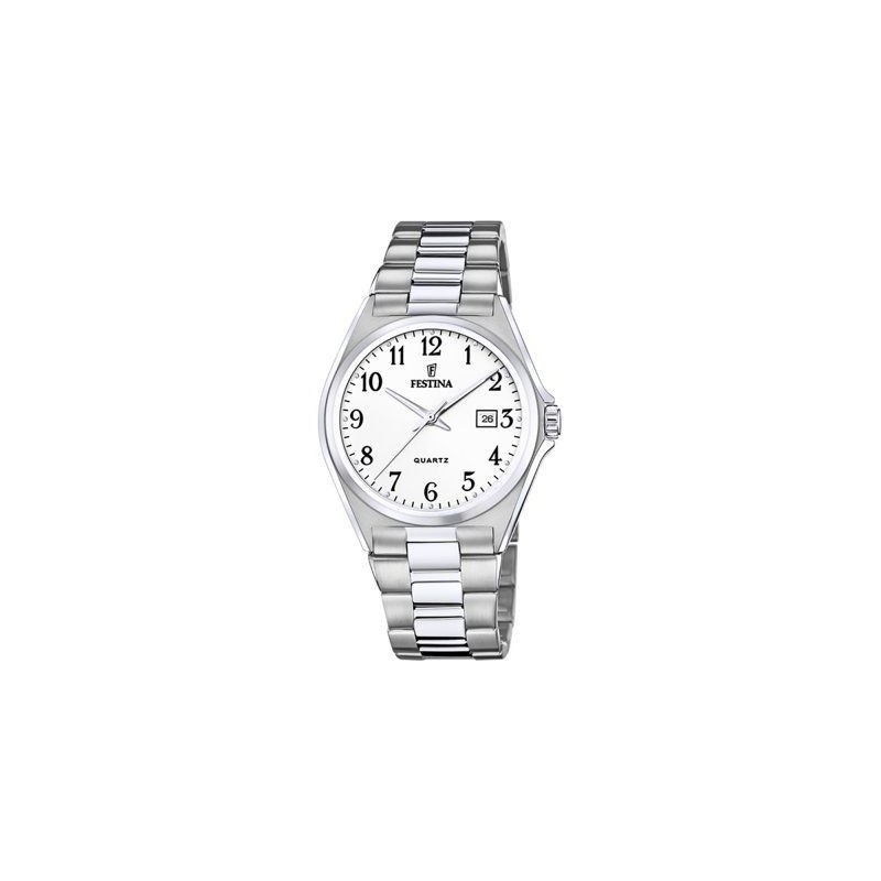 Montre FESTINA, Mouvement quartz + dateur, boitier acier (diam. 41mm), fond blanc, bracelet acier.