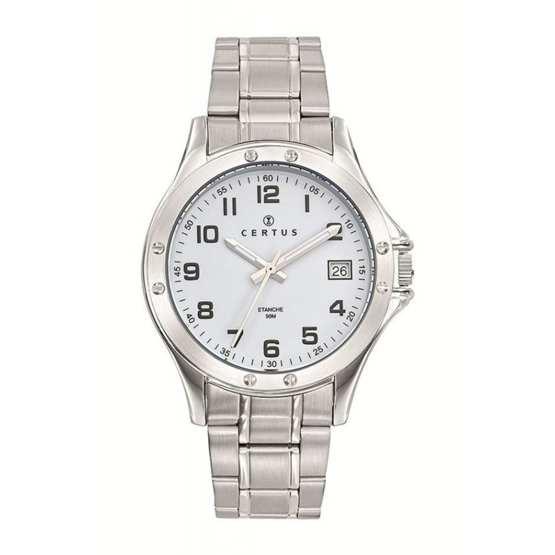 Montre CERTUS, Mouvement quartz + dateur, boitier acier (diam. 39mm), fond blanc, bracelet acier.