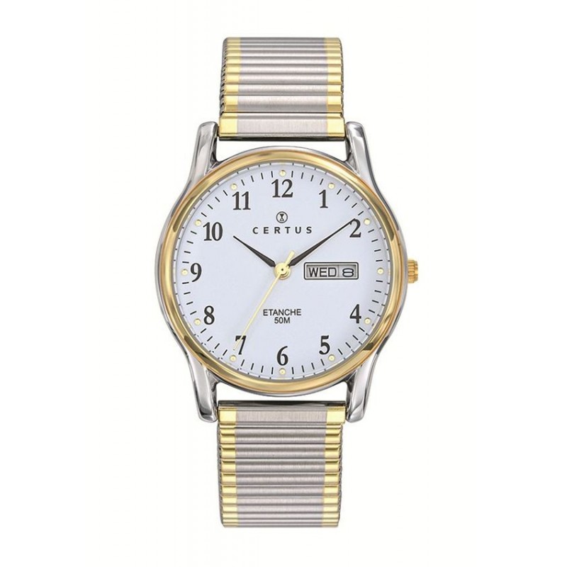 Montre CERTUS, Mouvement quartz + dateur, boitier acier (diam. 35mm), fond blanc, bracelet acier extensible bicolore.