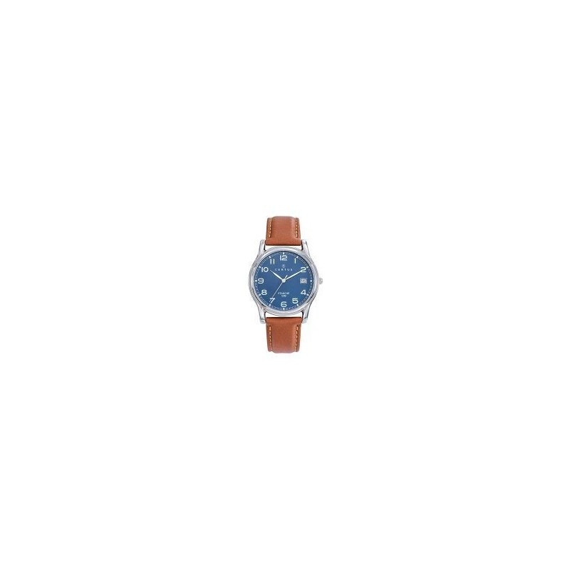 Montre CERTUS, Mouvement quartz + dateur, boitier acier (diam. 35mm), fond bleu, bracelet cuir marron.
