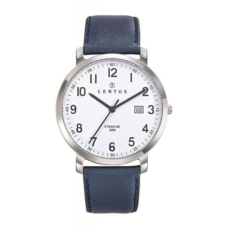 Montre CERTUS, Mouvement quartz + dateur, boitier acier (diam. 40mm), fond blanc, bracelet cuir bleu.