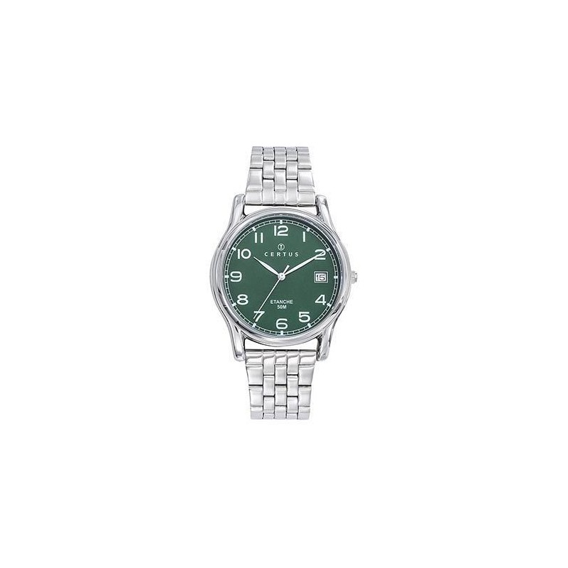 Montre CERTUS, Mouvement quartz + dateur, boitier acier (diam. 35mm), fond vert, bracelet acier.