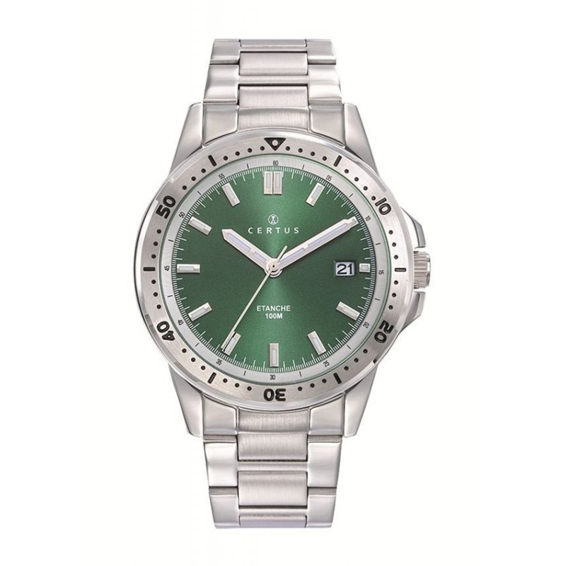 Montre CERTUS, Mouvement quartz + dateur, boitier acier (diam. 40mm), fond vert, bracelet acier.