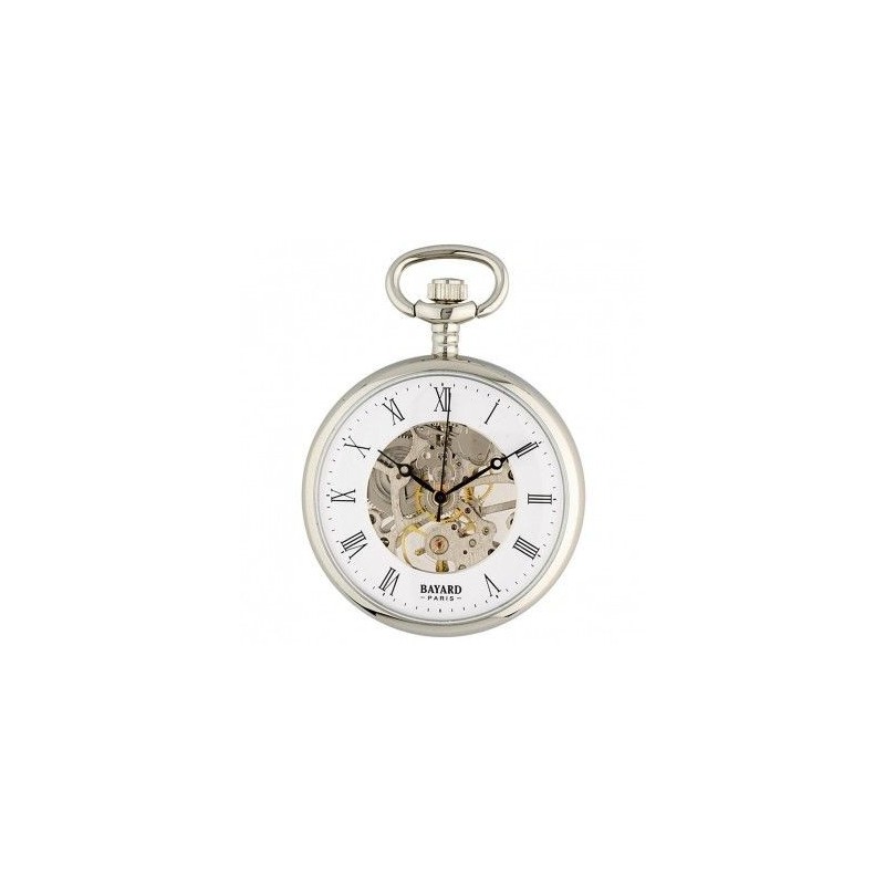 Montre de poche, Mouvement automatique, boitier (diam. 45mm), fond blanc squelette, chaine argent.