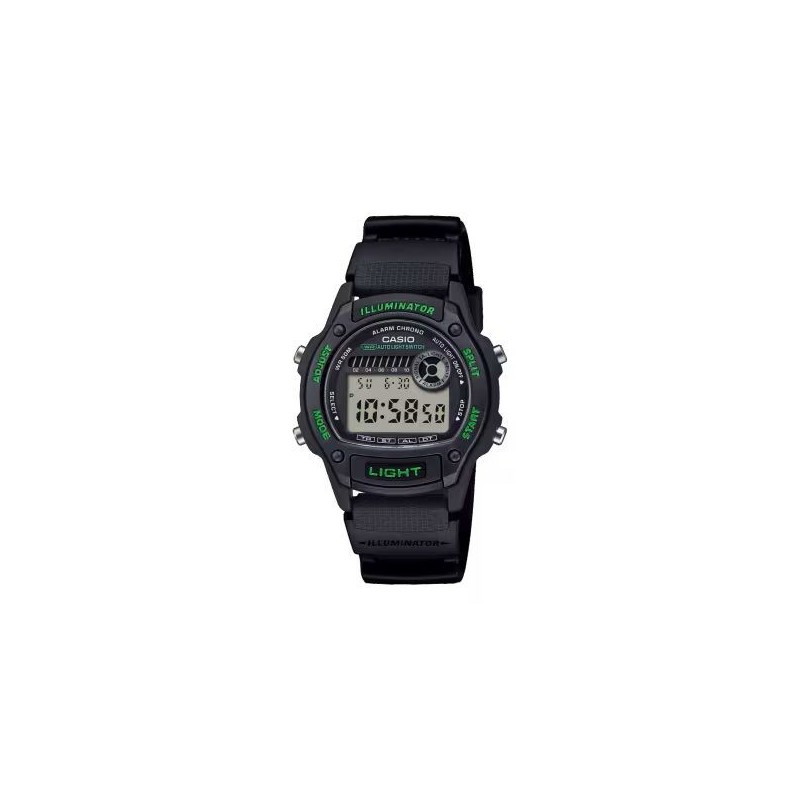 Montre CASIO, Mouvement quartz + dateur, boitier acier (diam. 37mm), affichage digital, bracelet résine noir. Fonctions: Chronomètre, Alarme, compte à rebours, heure universelle.