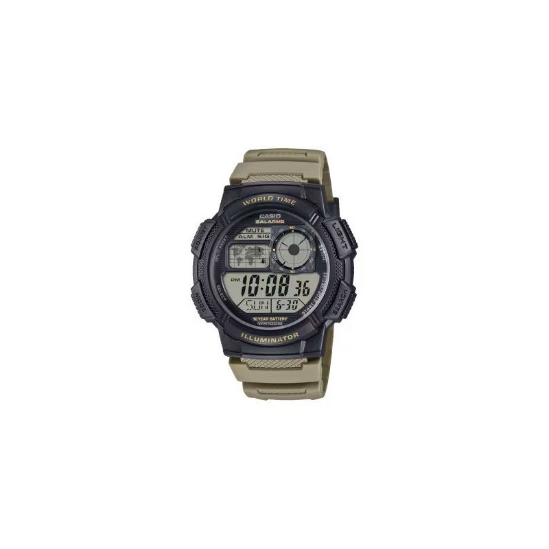 Montre CASIO, Mouvement quartz + dateur, boitier résine (diam. 45mm), fond affichage, bracelet résine kaki. Fonction: Chronomètre, alarme, compte à rebours, heure universelle.