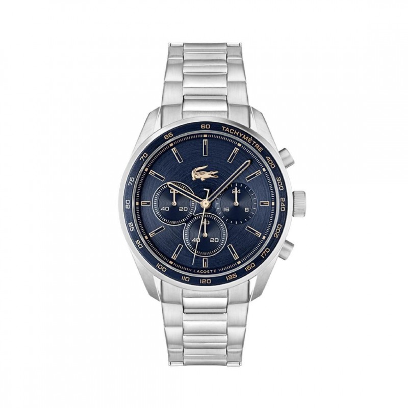 Montre LACOSTE, Mouvement quartz, boitier acier (diam. 42mm), fond bleu, bracelet acier. Fonction: Chronomètre.