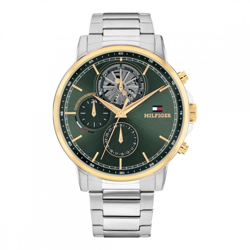 Montre TOMMY HILFIGER, Mouvement quartz + dateur, boitier acier (diam. 44mm), fond vert, bracelet acier.
