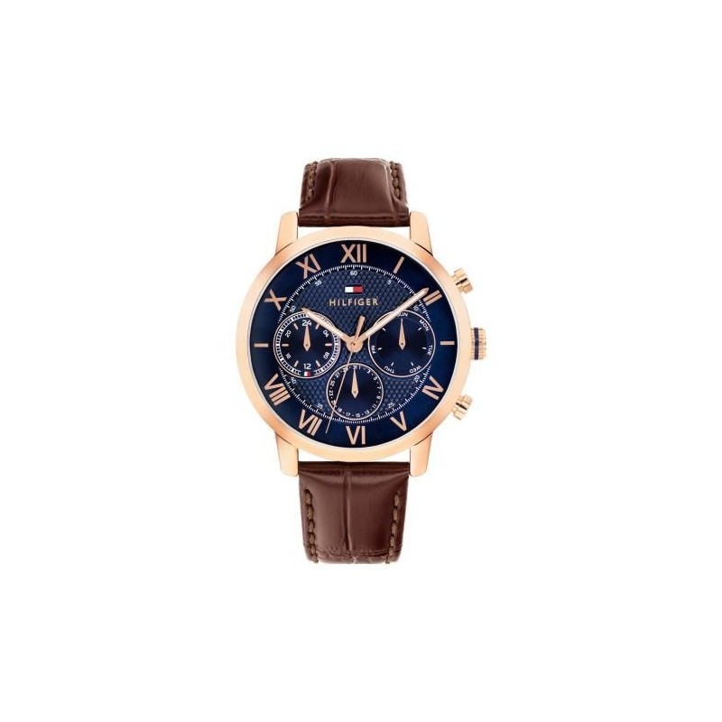 Montre TOMMY HILFIGER, Mouvement quartz + dateur, boitier acier (diam. 42mm), fond bleu, bracelet cuir marron.
