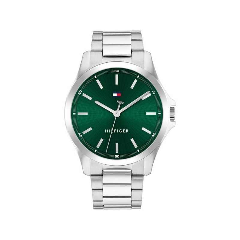 Montre TOMMY HILFIGER, Mouvement quartz, boitier acier (diam. 43mm), fond vert, bracelet acier.