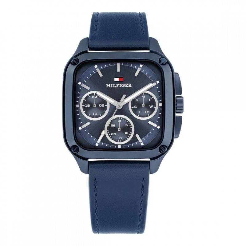 Montre TOMMY HILFIGER, Mouvement quartz + dateur, boitier acier (diam: 39mm), fond bleu, bracelet cuir bleu.