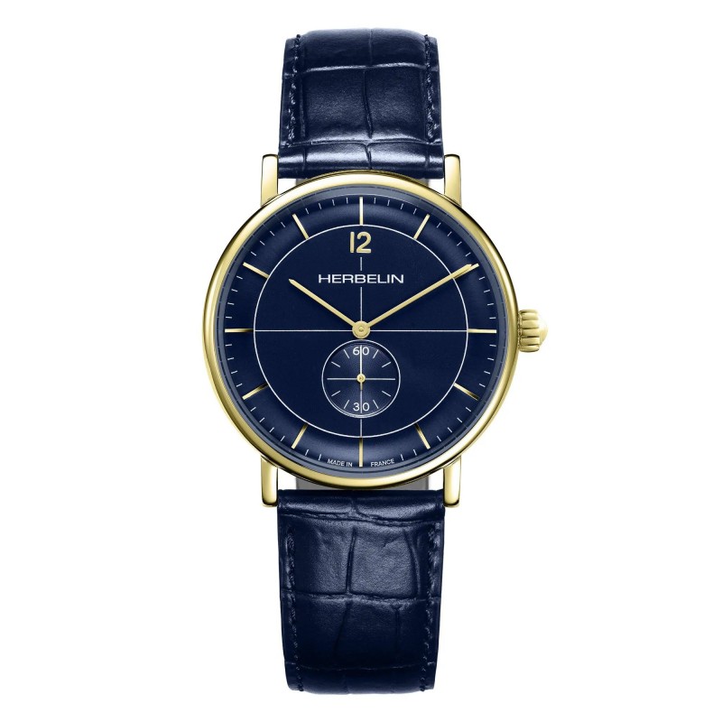 Montre HERBELIN, Mouvement quartz, boitier acier (diam. 40mm), verre saphir, fond bleu, bracelet cuir bleu avec boucle traditionnelle.