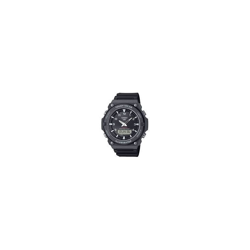 Montre CASIO, Mouvement quartz solaire + dateur, boitier résine (diam. 50mm), fond noir et affichage, bracelet résine noir. Fonctions: Chronomètre, alarmes, compte à rebours, heure universelle.