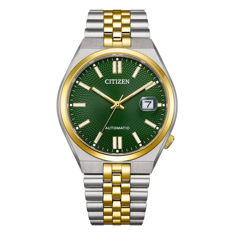 Montre CITIZEN, Mouvement automatique + dateur, boitier acier (diam. 40mm), verre saphir, fond vert, bracelet acier bicolore (doré et argenté).