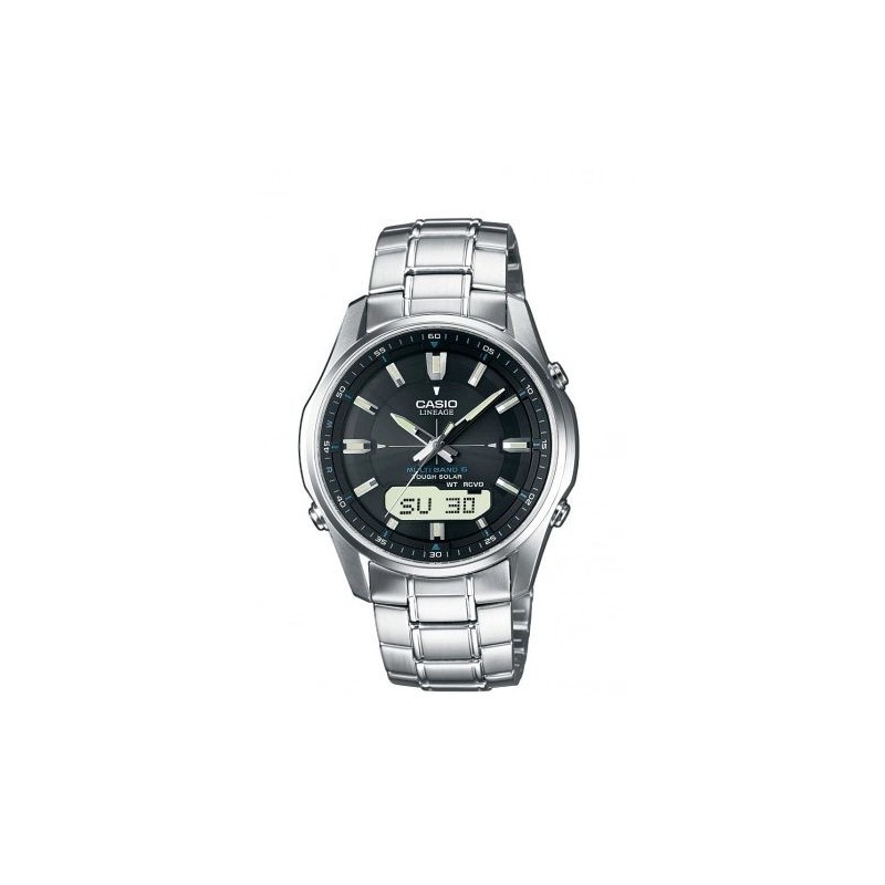 Montre CASIO, Mouvement quartz + dateur, boitier acier (diam. 40mm), fond bleu et affichage, bracelet acier. Fonction: Chronomètre, alarme, compte à rebours, heure universelle. Etanchéité: 5 ATM. Garantie 2 ans