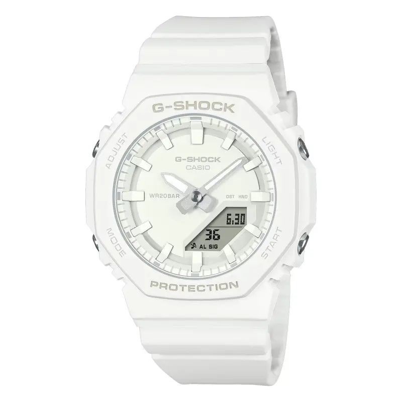 Montre CASIO, Mouvement quartz + dateur, boitier résine (diam. 46mm), fond blanc et affichage, bracelet résine blanc. Fonction: Chronomètre, alarme, compte à rebours, heure universelle.