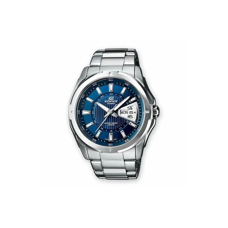 Montre CASIO, Mouvement quartz + dateur, boitier acier (diam. 45mm), fond bleu, bracelet acier.