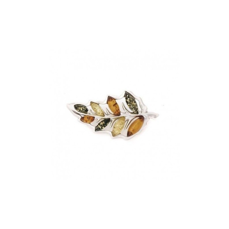 Broche OPALOOK en argent 925/1000 rhodié en forme de feuille avec ambre verte, cognac et miel.