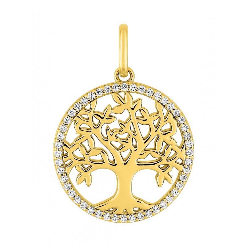 Pendentif en plaque or rond avec arbre de vie sertis d'oxydes de zirconium sur bélière mobile.