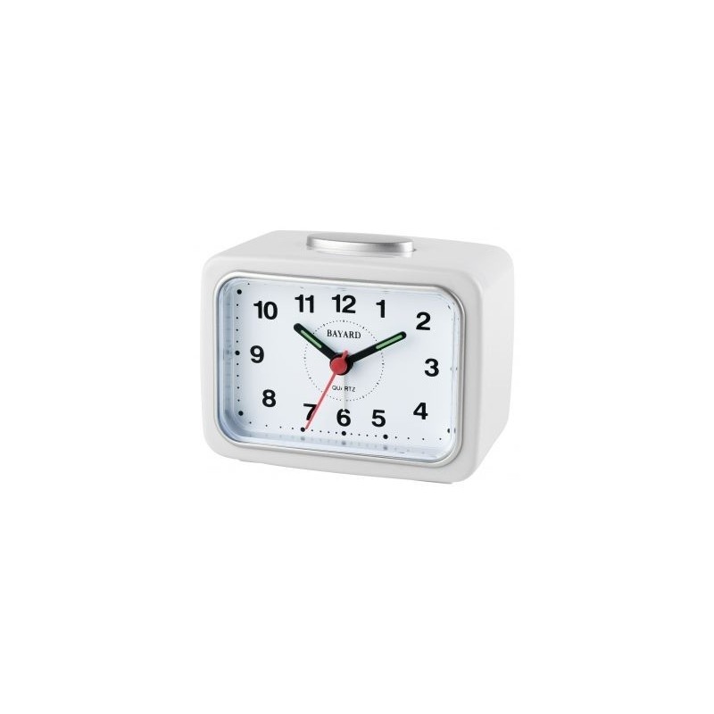 Reveil, Mouvement quartz silencieux, en plastique (7.5x9.7cm), fond blanc, entourage blanc.