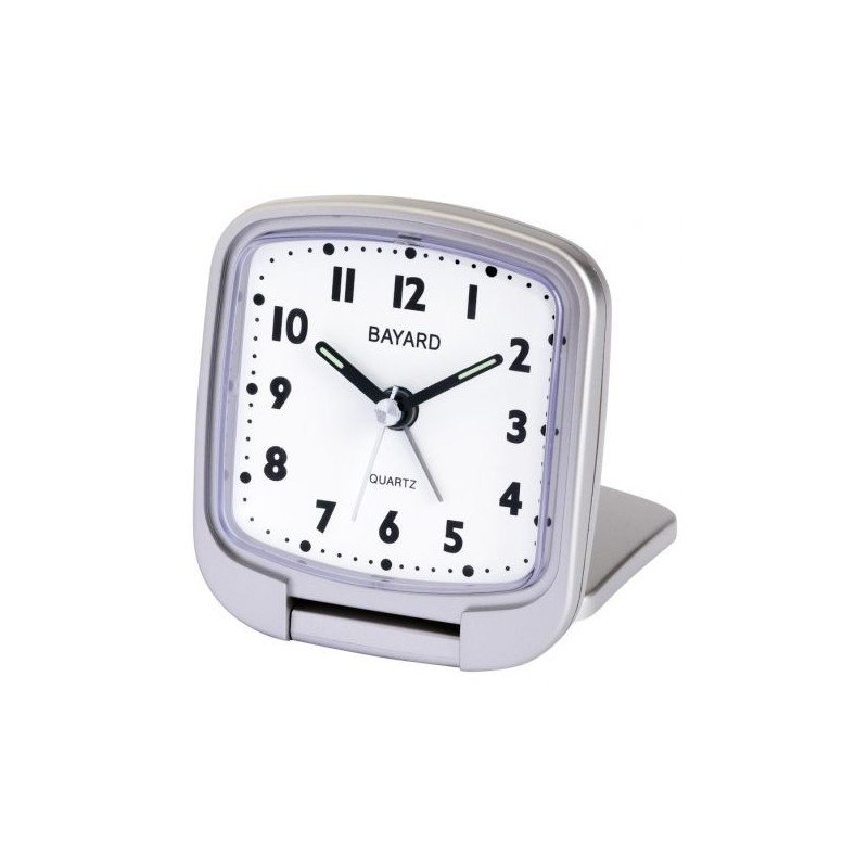 Reveil, Mouvement quartz silencieux, en plastique (7.6x6.8cm), fond blanc, entourage gris.