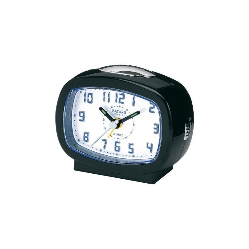 Reveil, Mouvement quartz silencieux, en plastique (7.2x9cm), fond blanc, entourage noir.