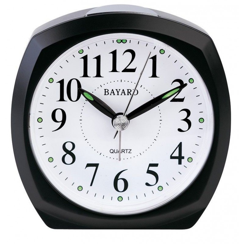 Reveil, Mouvement quartz silencieux, en plastique (8.5x8.5cm), fond blanc, entourage noir.